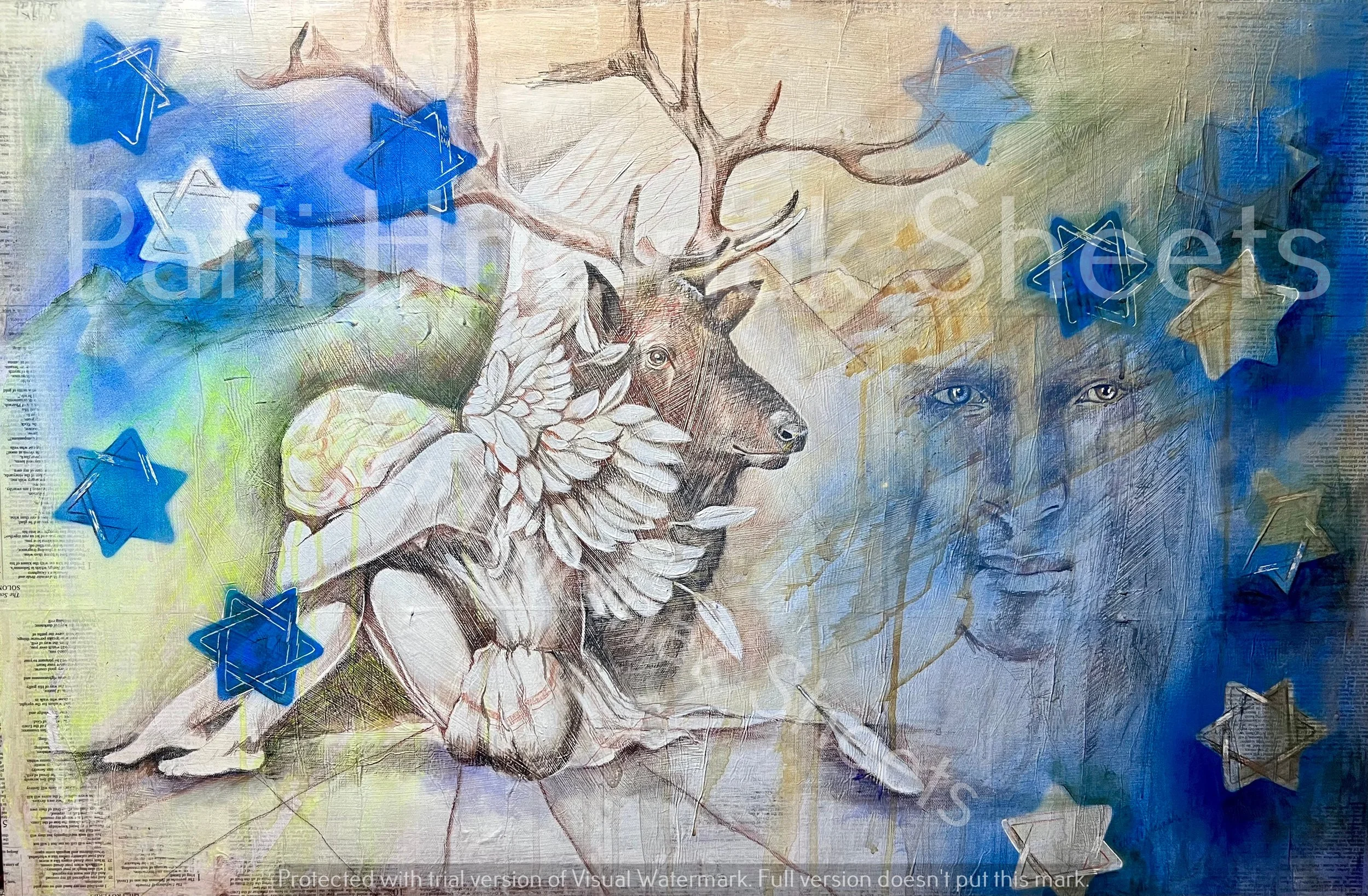 I added 12 Stars of David and blue colors. Jacob’s face emerges as a young man yet to have been named Israel with 12 sons. The angel figure and the American elk I need not describe. It’s my artist’s right.